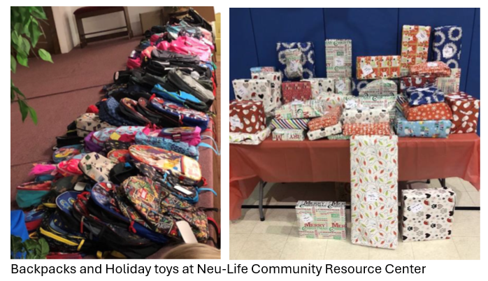 In May, Club members helped support Neu-Life’s 9th annual Art show. In July, Members helped support the Neu-Life career Fair. August found members stuffing backpacks with donated school supplies for Neu-Life students. This has become an annual event. In December of each year, Zontians purchased gifts for the students.